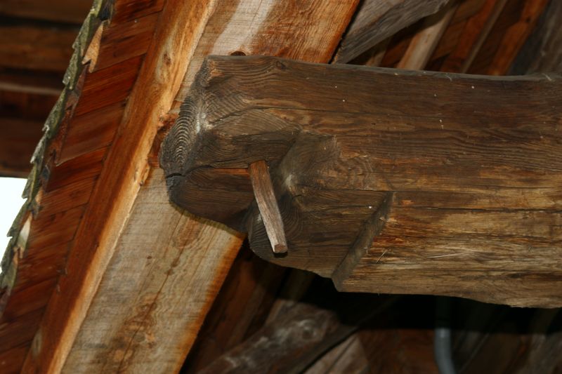 Fragment konstrukcji dachu spichlerza ze Złotej. Na zdjęciu widoczny tzw. ostatek lub wypust – czyli wychodzącą poza zewnętrzną ścianę budynku część belki stropowej podciągowej. Dłuższe, profilowane (tak, jak na zdjęciu) wypusty, które miały funkcję wsporników konstrukcji dachu nazywa się rysiami.