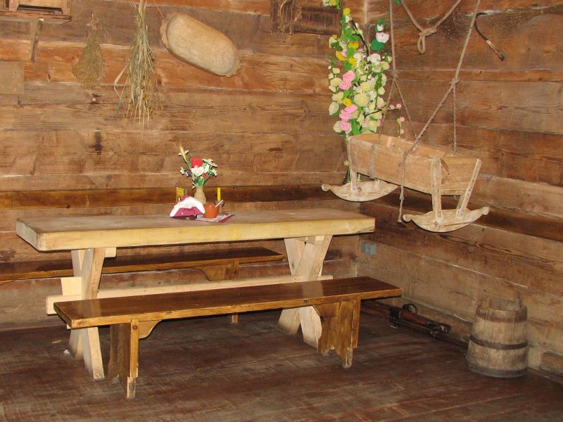 Stylizowana na wnętrze wiejskiej chałupy gospoda „Pod Białą Górą” mieszcząca się w spichlerzu ze wsi Przeczyca z 1732 roku. Pod sufitem wisi drewniana kołyska na biegunach. Na zdjęciu widać też drewniane wiadro i nieckę na chleb.