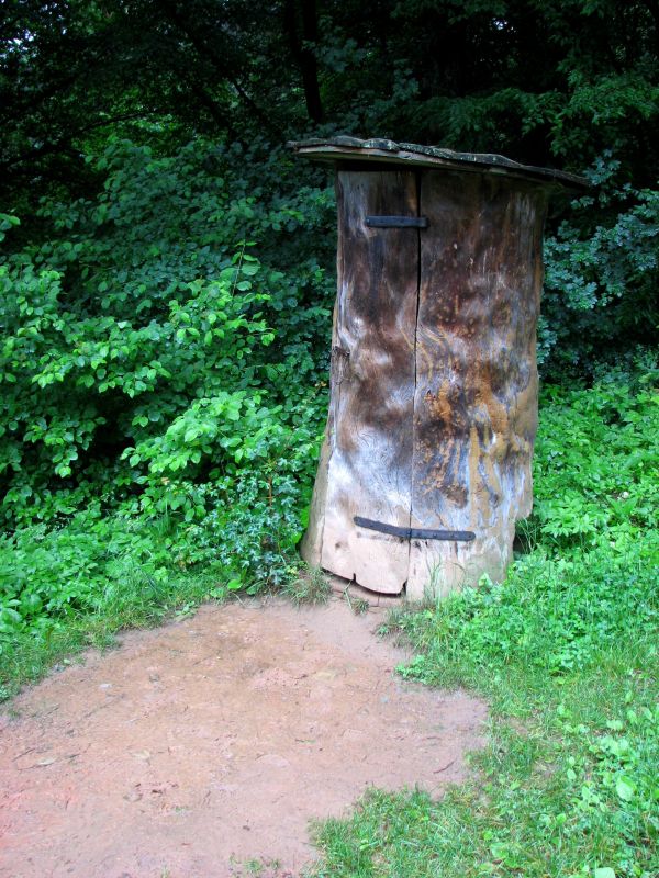 Ustęp ze wsi Samoklęski z 1941 roku. Ustęp wydrążony w pniu, umieszczony przy wyłożonym kamieniami gnojowniku.