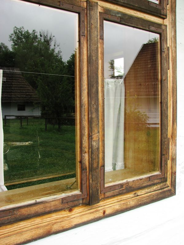 Okno budynku mieszkalno_gospodarczego z Glinnego (pow. leski) z 1925 roku. Budynek z kantówek jodłowych wiązanych w węgłach „na rybi ogon”. Dach czterospadowy, kryty gontem. Budynek pobielany wapnem, z gankiem. Po jednej stronie sieni dwie izby mieszkalne, po drugiej – stajnia i boisko.