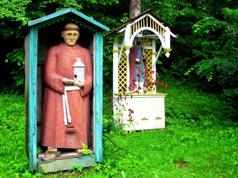 Ule figuralne z pasieki. Na pierwszym planie ul figuralny ze wsi Stróże koło Grybowa z przedstawieniem św. Franciszka. Wlot dla pszczół znajduje się w małym ulu trzymanym przez św. Franciszka. Obok ul figuralny z przedstawienim św. Ambrożego, patrona pszczelarzy.