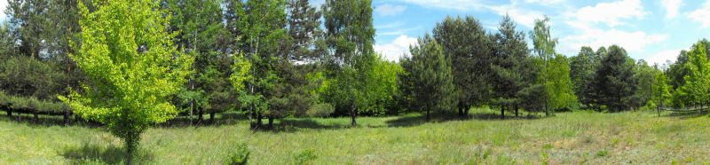 Panorama obszarów leśnych okalających obiekty w skansenie w Kłóbce.
