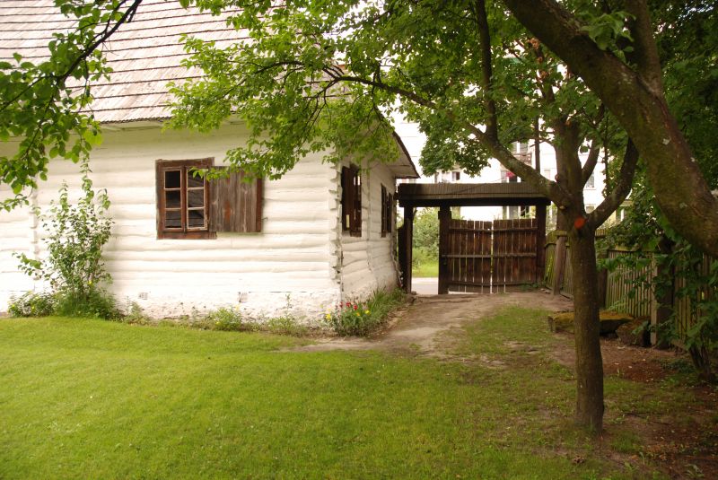 Podwórze zagrody sitarskiej w Biłgoraju. Na zdjęciu jedyna oryginalna brama wjazdowa, pozostałe bramy dodano po objęciu zagrody ochroną muzealną. Na zdjęciu widoczne elementy konstrukcji węgłowej "na rybi ogon".