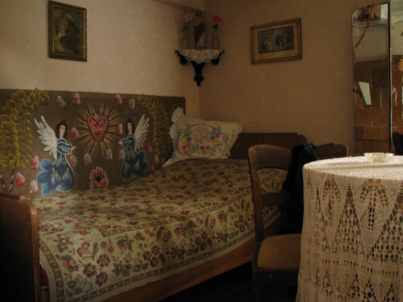 Wnętrze chałupy rybackiej, tradycyjny wystrój pokoju gościnnego.