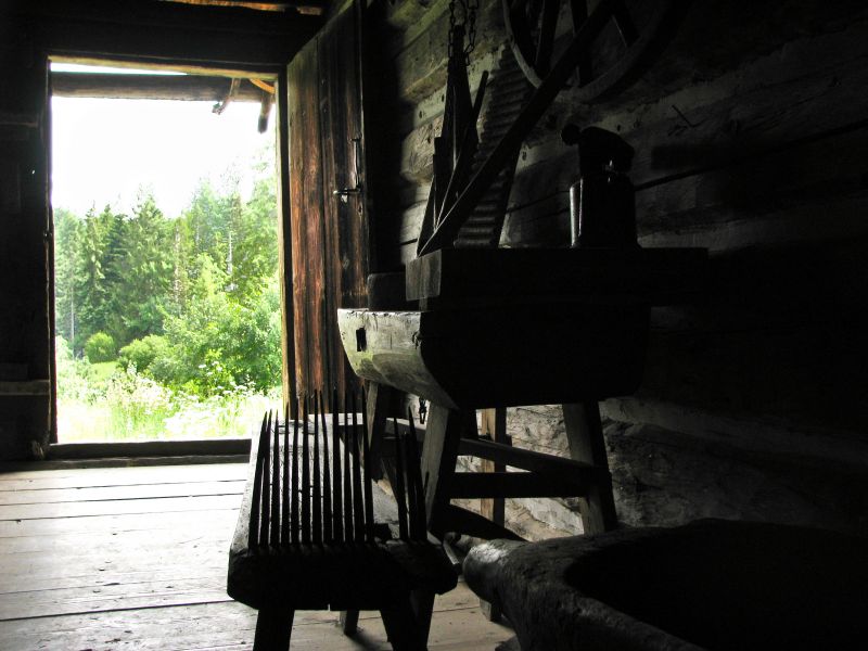 Boisko (sień) – środkowa część domu, przez którą wchodzi się do pozostałych pomieszczeń. Na zdjęciu widać stojące w bosku narzędzia wykorzystawszy w gospodarstwie domowym: żarna rotacyjne w obudowie drewnianej, magiel. Ściany o konstrukcji zrębowej z pobielonym wypełnieniem zrębu. Podłoga z desek.