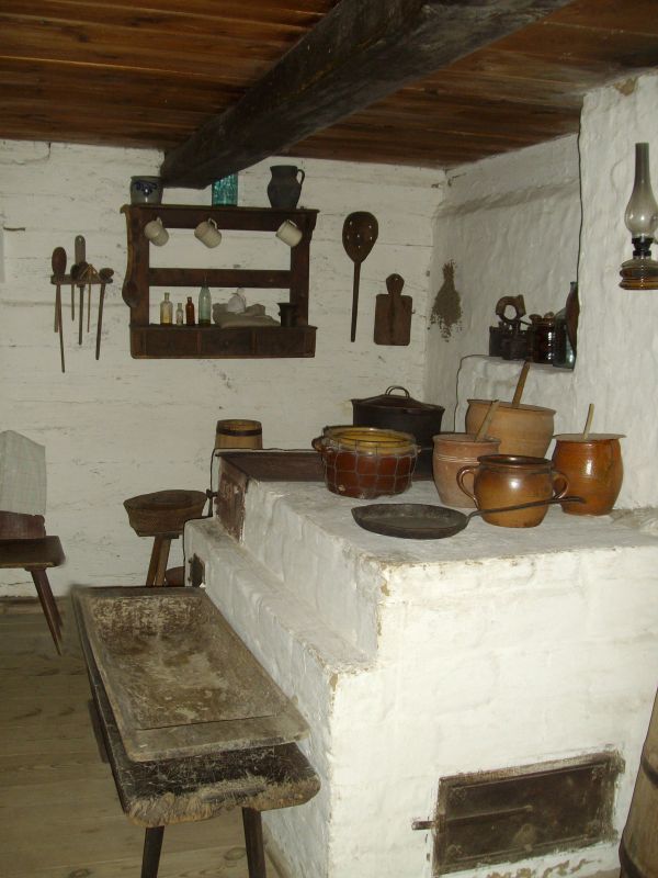 Wnętrze chałupy średniozamożnego gospodarza ze wsi Wolica (okolice Kalisza) z 1841 roku. Piec oraz naczynia kuchenne używane dawniej w Wielkopolsce.