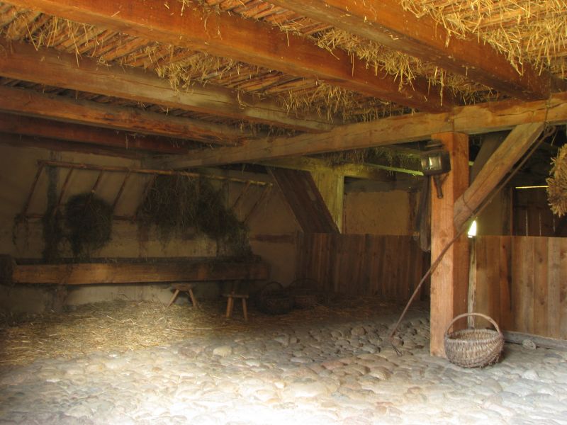 Wnętrze XIX wiecznej obory ze wsi Kartoszyno: żłoby.