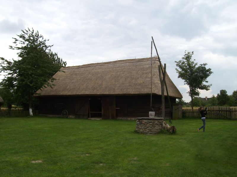Studnia z żurawiem o cembrowinie z kamienia polnego na terenie XIX-wiecznej zagrody średnio zamożnego chłopa ze wsi Wolica. W tle stodoła ze wsi Godziesze Wielkie o konstrukcji zrębowej. Dach czterospadowy kryty słomianą strzechą.