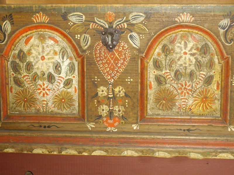 Zdobiona skrzynia wianna z 1895 rok wewnątrz chałupy olęderskiej. Skrzynia drewniana, malowana.