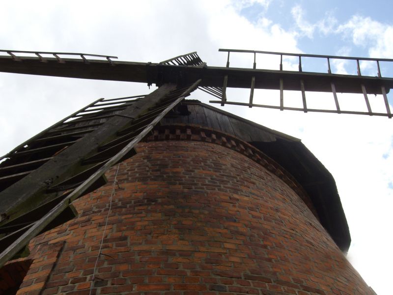 Wiatrak typu holender z 1810 roku ze wsi Trzuskołoń. Wiatrak murowany z cegły. Widok na skrzydła.