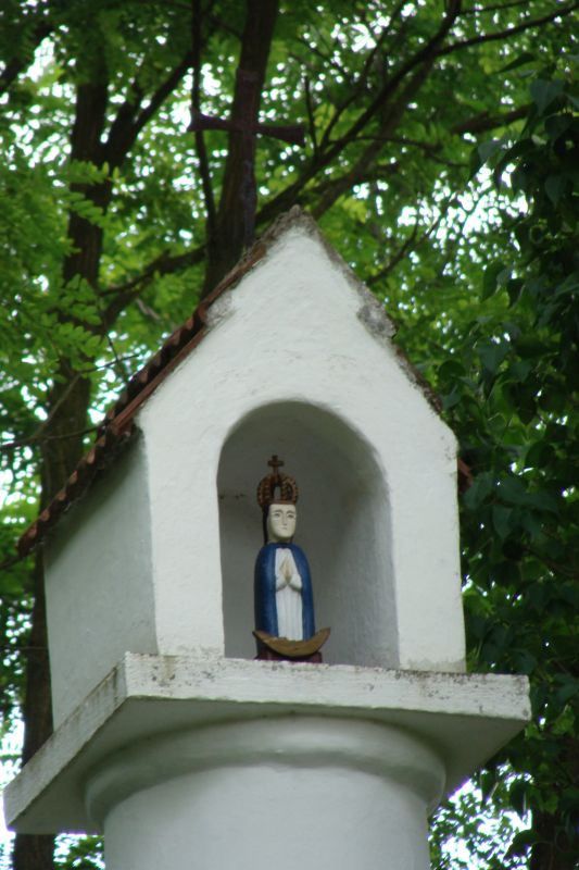 Kapliczka murowana z cegły wiązanej zaprawą cementową, otynkowana i bielona. Kopia kapliczki ze wsi Karwosieki (koło Płocka). Polichromowana figurka Matki Boskiej Skępskiej autorstwa Stanisława Dużyńskiego.