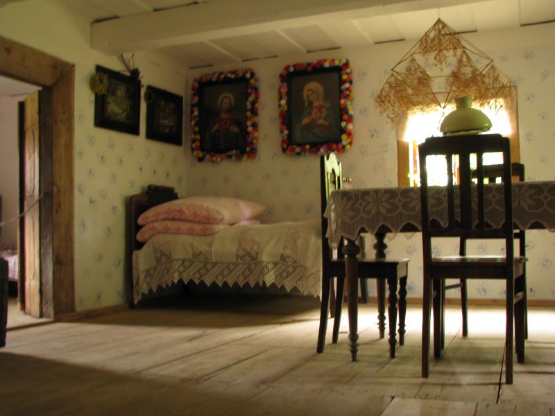 Izba biała w chałupie bogatego chłopa ze wsi Rakutowo z XVIII i XIX wieku. Widoczne łóżko przykryte haftowaną pościelą, obrazy – oleodruki ozdobione kwiatami z bibuły, pająk wiszący pod sufitem oraz wzory naniesione niebieską farbą na ścianę jako ozodoba. W oknie wiszą papierowe firanki. Podłoga z desek. |