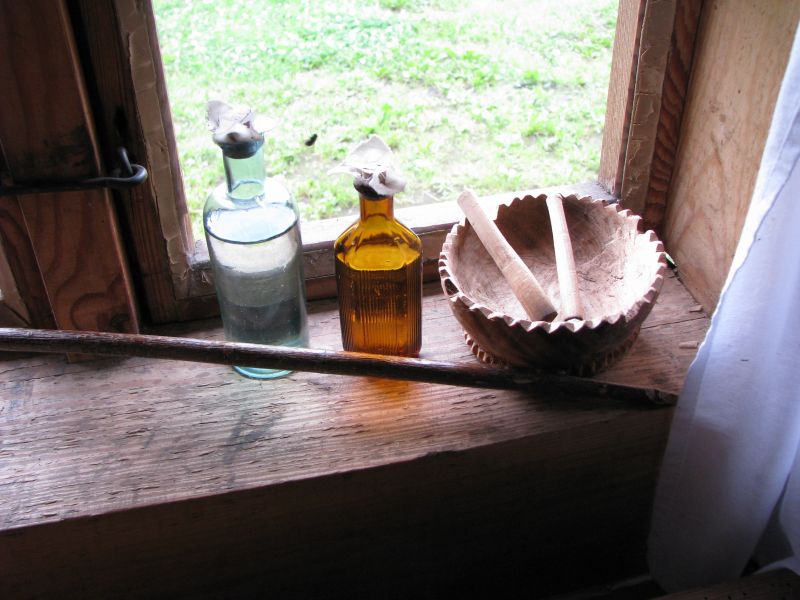Fragment okna ze stojącą na parapecie drewnianą popielniczką w chałupie bogatego chłopa ze wsi Rakutowo z XVIII i XIX wieku.