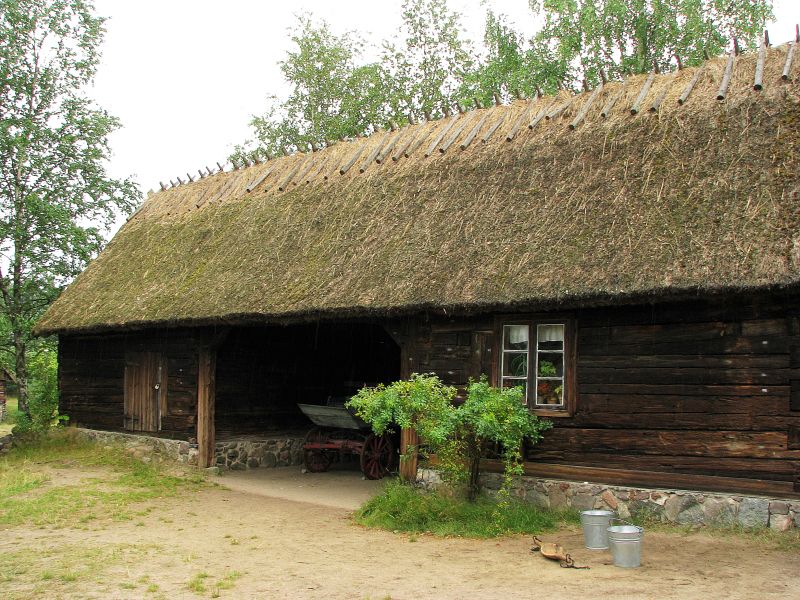 Budynek ze wsi Nakla z XVIII wieku. Budynek o konstrukcji zrębowo-szkieletowej. Dach dwuspadowy kryty płasko słomą. Kalenica wzmocniona kozłowaniem. Podmurówka z kamienia. Pierwotnie chlew z przejazdem bramnym, w którego części na początku XX wieku utworzono mieszkanie dla rodziny robotnika rolnego tworząc tzw. chałupę robotniczą. Fragment zagrody gburskiej z Nakli. |