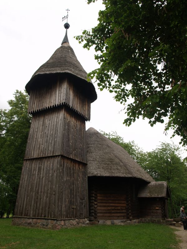 Kościół ze wsi Rychnowo z lat 1712-1714. Kościół na planie ośmioboku, z niewielką kruchtą (głównym wejściem do kościoła) przy ścianie południowej i zakrystią przy ścianie północnej. Podmurówka z kamieni polnych. Budynek o konstrukcji zrębowej z nakładkami łączonymi na "rybi ogon" z uciętymi skośnie ostatkami wystającymi poza narożniki budynku. Dach ośmiospadowy, poszyty trzcinianą strzechą. Wieża o konstrukcji słupowo-szkieletowej pokrytej szalunkiem. Najwyższe piętro szalunku ozdobnie profilowane. |
