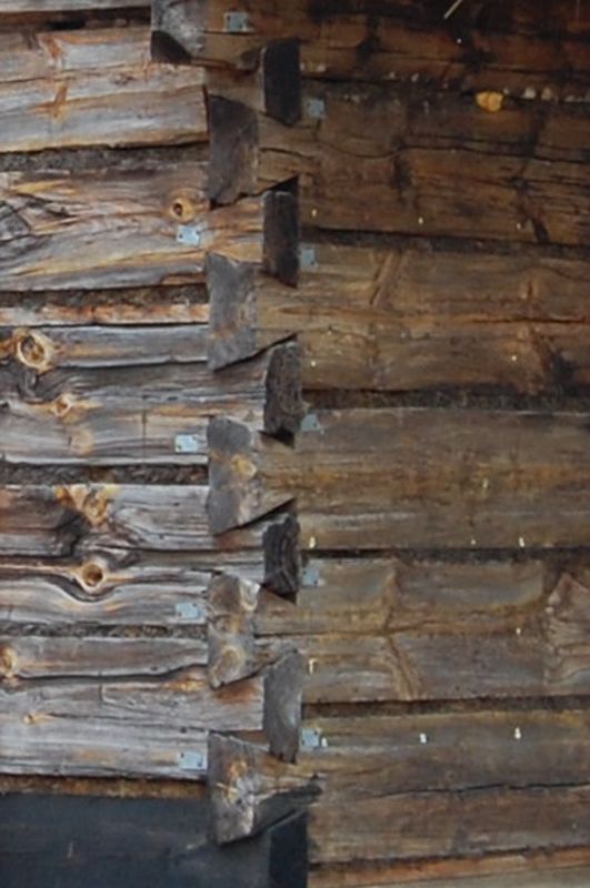Konstrukcja zrębowa z węgłami wiązanymi "na rybi ogon". Chałupa kurpiowska ze wsi Tatary.