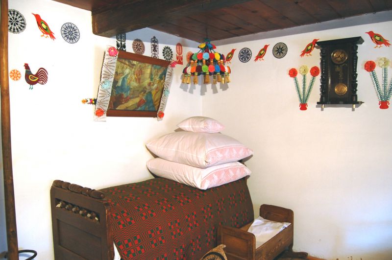 Duża izba, łóżko i poduszki z ręcznie wyszywanymi poszewkami.