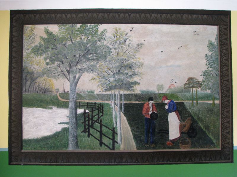 Zagroda Albrechta w Swołowie - wnętrze domu. Na zdjęciu przedwojenny rysunek namalowany na ścianie w sieni domu mieszkalnego.