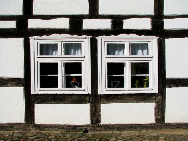 Zagroda Albrechta w Swołowie. Na zdjęciu fragment konstrukcji szachulcowej (konstrukcji szkieletowej) z oknami. Dom mieszkalny.