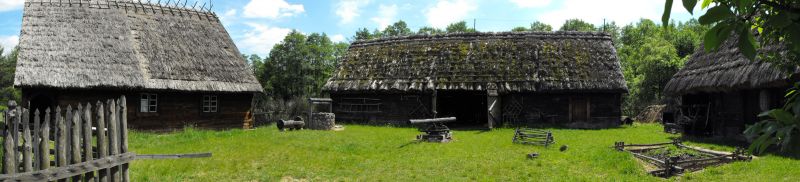 Panorama zagrody dobrzyńskiej typowej dla bogatych gospodarstw na Kujawach południowo-wschodnich. Budynki pochodzące z połowy i końca XIX wieku. Zagroda składa się z chałupy, stodoły i dwóch budynków gospodarczych, ustawionych na planie czworoboku. W obejściu studnia z kołowrotkiem, „gnojownik”, „maneż” – kierat. |