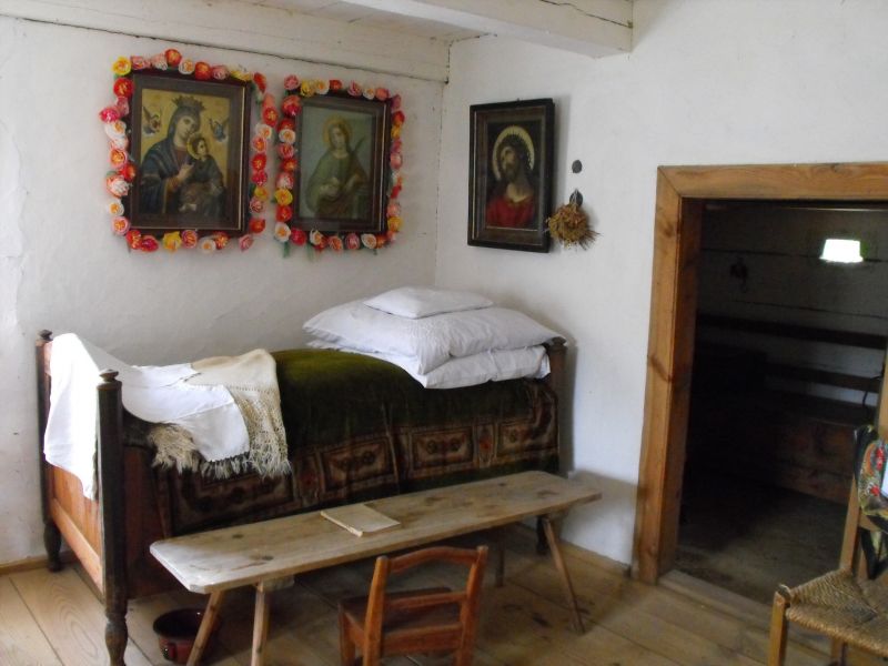 Wnętrze izby dziadkow, zwanej „mieszkaniem deputowanym” w chałupie kujawskiej z wsi Pułkowo Wielkie z ok. 1780 r. Widoczne łóżko, krzesło, ława i religijne oleodruki na ścianach.