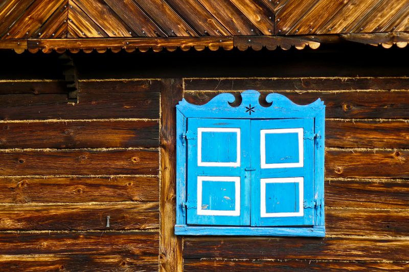 Drewniana, ozdobna okiennica nadokiennik – fragment litewskiej chałupy ze wsi Pempen (obecnie Pempiai) z przełomu XVIII i XIX wieku. Na zdjęciu widać też fragment ściany sumikowo-łątkowej.