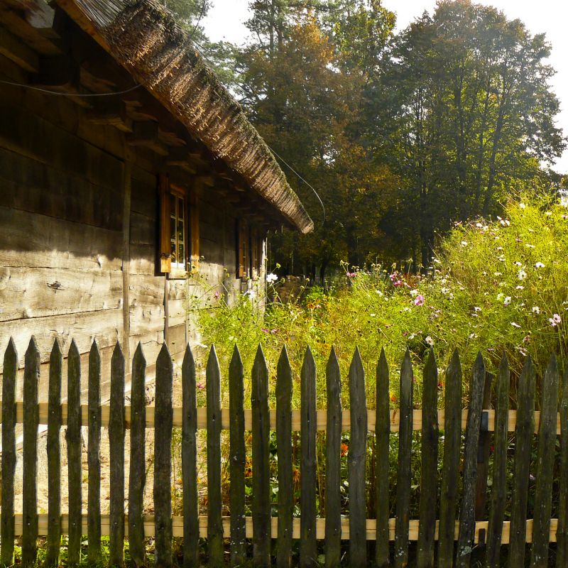 Kwiatowy ogród przydomowy przed chałupą ze wsi Nowa Różanka z pierwszej połowy XIX wieku. Budynek o konstrukcji zrębowej mieszanej z sumikowo-łątkową. Dach dwuspadowy kryty trzcinową strzechą.