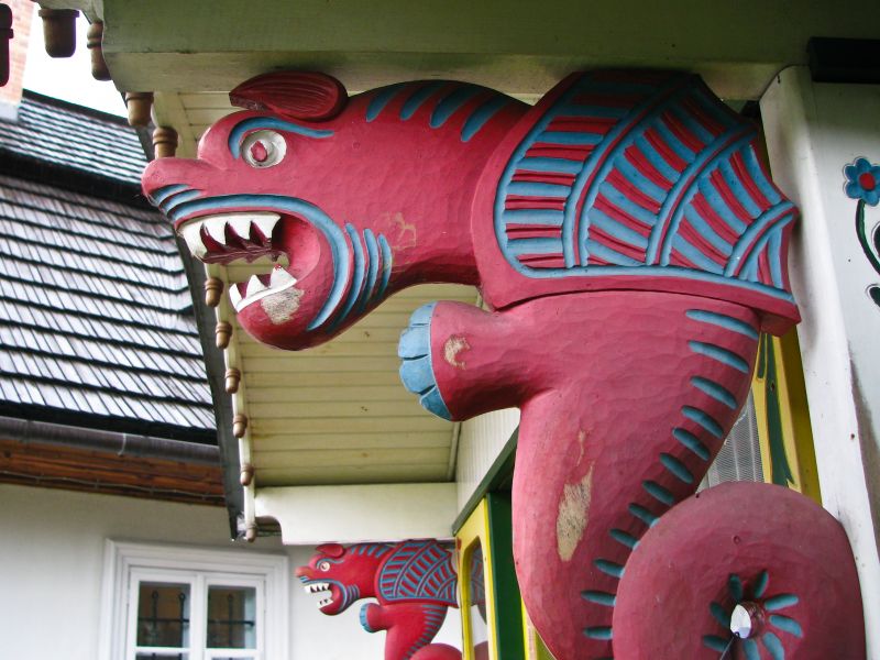 Rzeźbione, polichromowane smoki - detal wozu cygańskiego.