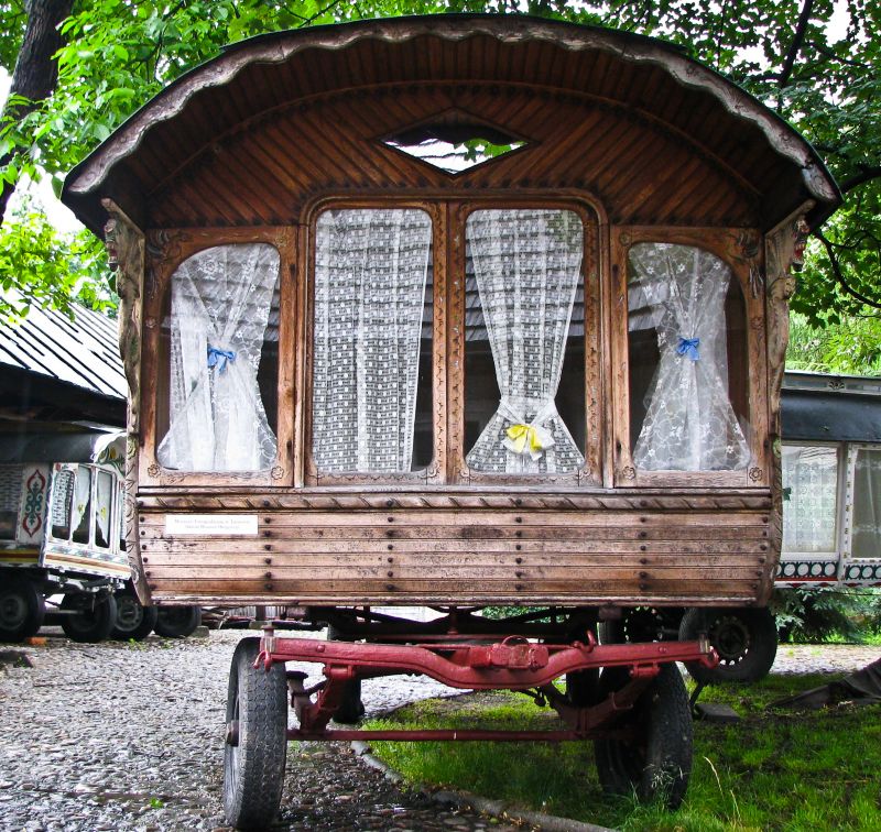 Przednia ściana wozu cygańskiego. Drewniana obudowa wozu zdobiona szalunkiem, drewnianymi figurami smoków i lusterkami. Wóz z metalowym dyszlem i kołami samochodowymi.