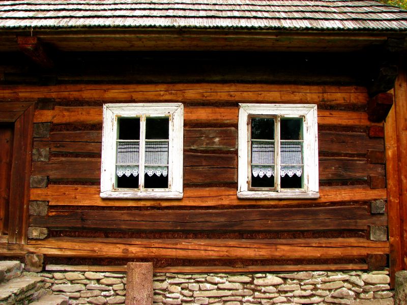 Chałupa wójta Maja (Kostkowiaka), z Sidziny, z II połowy XVIII wieku. Na zdjęciu widoczne okna, elementy konstrukcji zrębowej oraz podmurówka z kamieni.