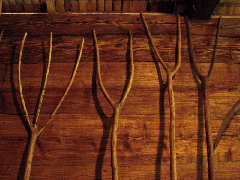 Muzeum Kultury Łemkowskiej w Zyndranowej. Wnętrze chyży - strojące na boisku widły drewniane, wykorzystujące naturalny kształt gałęzi.