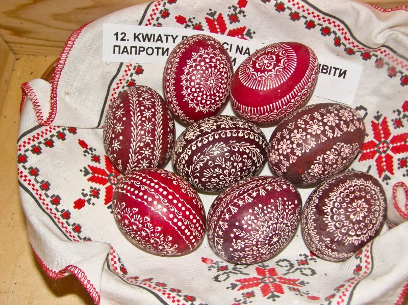 Muzeum Kultury Łemkowskiej w Zyndranowej. Wnętrze chyży - ekspozycja pisanek, w większości autorstwa urodzonej w Łabowej łemkowskiej artystki Aleksandry Hryńczuk-Polańskiej.