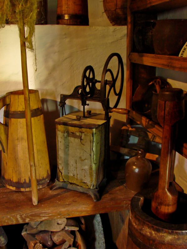 Muzeum Kultury Łemkowskiej w Zyndranowej. Wnętrze chyży - eksponowany w izbie sprzęt kuchenny, m.in. maselnice.