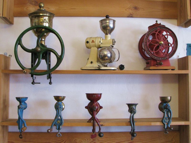 Fragment ekspozycji muzeum Zagroda Młyńska w Bogdańcu. Na zdjęciu kolekcja młynków i maszynek do mielenia.
