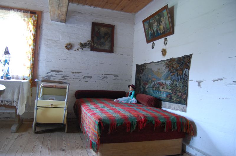 Wózek dla dziecka i łózko z tkanym kilimem z lat 60-tych XX w w chałupie ze wsi Baranowo.