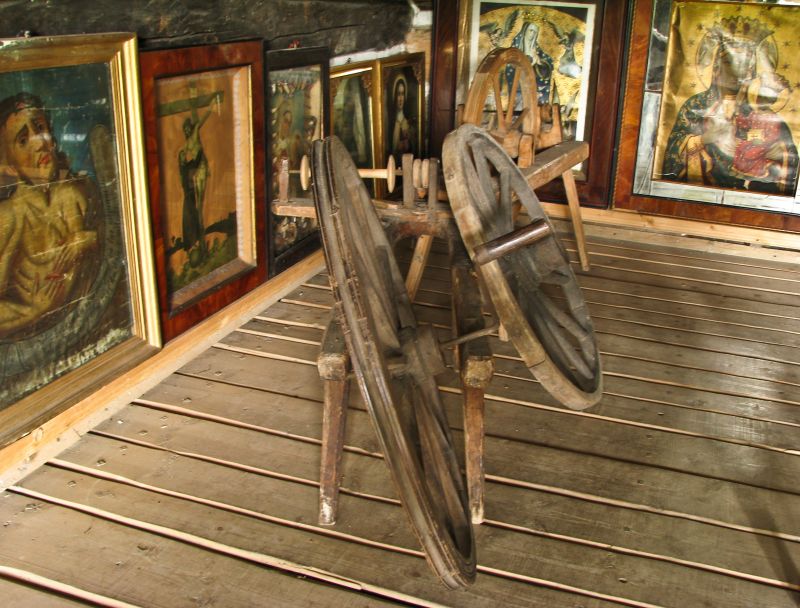 Kołowrotek, koła od wozu i oleodruki wewnątrz stajni Słopiakowej.