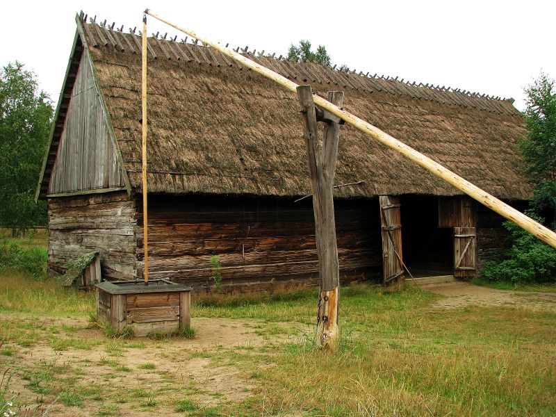 Kaszubska zagroda gburska z Nakli. Na zdjęciu widoczna stodoła ze wsi Szablewo z 1748 roku. Budynek o konstrukcji zrębowej. Dach dwuspadowy kryty płasko słomą. Kalenica wzmocniona kozłowaniem. Przed budynkiem drewniana studnia z żurawiem.