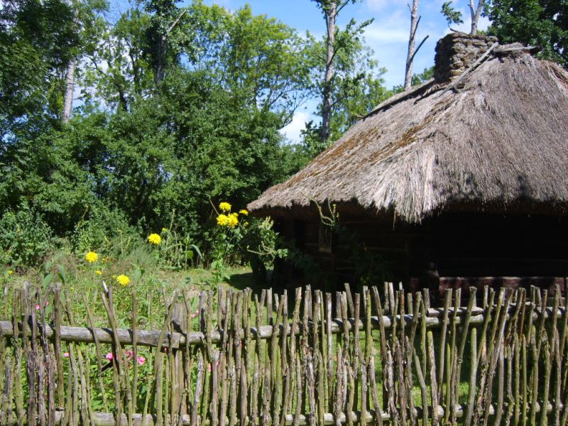 Jedna z chałup w Muzeum Wsi Opolskiej. Budynek o konstrukcji zrębowej, dach czterospadowy kryty słomą z widocznym systemem kominowym.