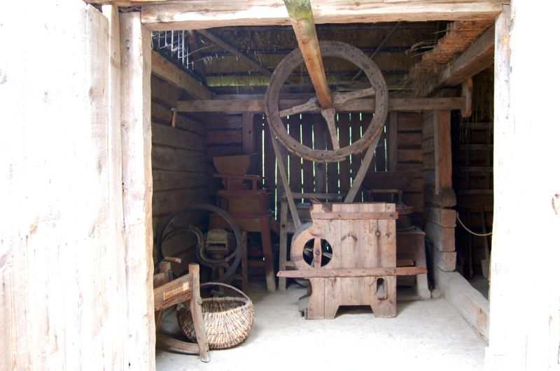 Część kieratu (urządzenie do napędzania stacjonarnych maszyn rolniczych) przed XIX-wieczną stodołą ze wsi Wejdy.