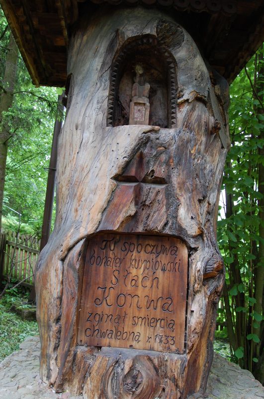 Pomnik Stacha Konwy z 1965 roku. Rekonstrukcja pomnika postawionego w 1922 roku w lesie pod wsią Jednaczewo. Legendarny bohater kurpiowski, Stach Konwa dowodził oddziałem strzelców kurpiowskich, biorącym udział w walkach o tron Polski w 1733 roku po stronie króla Stanisława Leszczyńskiego. W walce z połączonymi siłami sasko-rosyjskimi zginął prawie cały oddział Kurpiów. Stach Konwa został pojmany i za odmowę przyłączenia się do stronnictwa saskiego powieszony. W wydrążonej barci znajduje się figura Chrystusa Frasobliwego. |