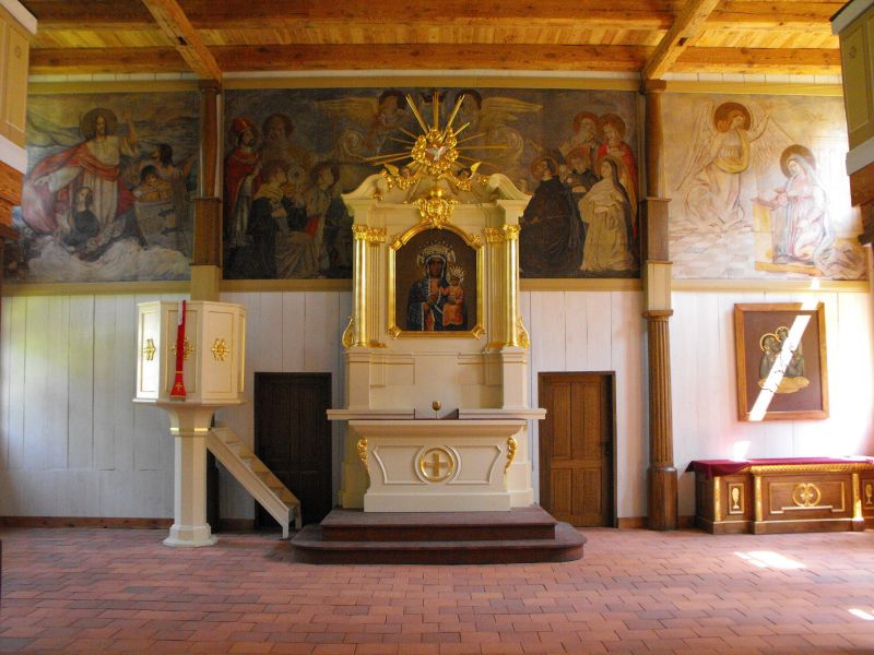 Wnętrze kościoła pod wezwaniem świętego Andrzeja Boboli. Ołtarz i ambona. W latach 70. XX w. powyżej ołtarza, na drewnianych płytach zamieszczono wielkoformatową polichromię łódzkich malarzy Józefa Wasiołka i Mieczysława Saara.