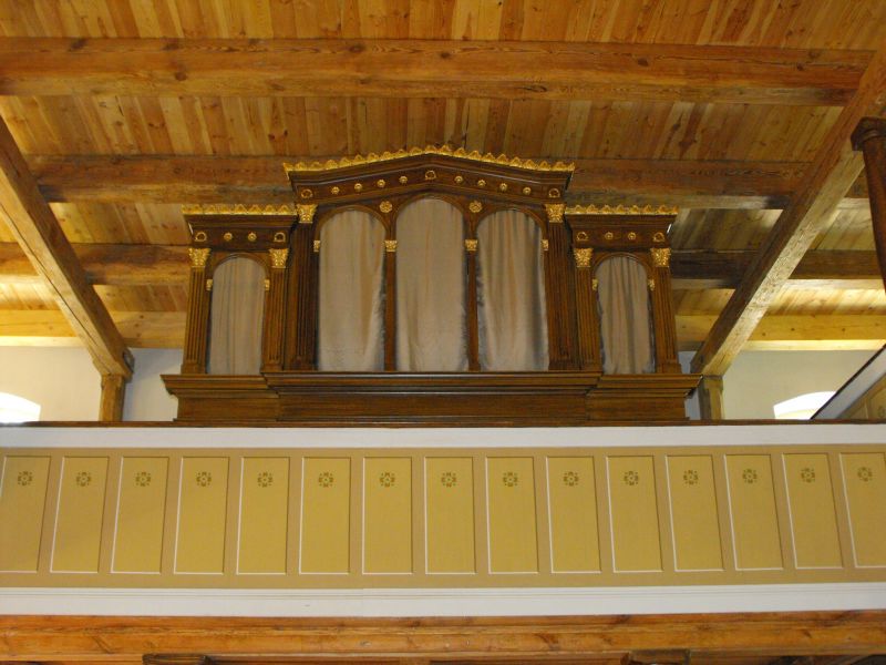 Chór z organami we wnętrzu kościoła pod wezwaniem świętego Andrzeja Boboli. Prospekt organowy pozostał jeszcze z najstarszego, ewangelickiego wystroju kościoła.