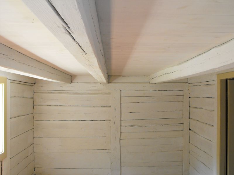 Bielone belki stropowe w izbie robotniczej. Podczas prac konserwatorskich we wszystkich budynkach wykonano odkrywki, pozwalające na jak najwierniejsze odtworzenie ich pierwotnej kolorystyki. We wnętrzach domów pozostawiono na pierwszej kondygnacji ściany nietynkowane, jedynie pobielone, odsłaniające konstrukcję budynku (pierwotnie ściany i sufity kryte były trzciną i tynkowane). Ściany o konstrukcji sumikowo-łątkowej. |