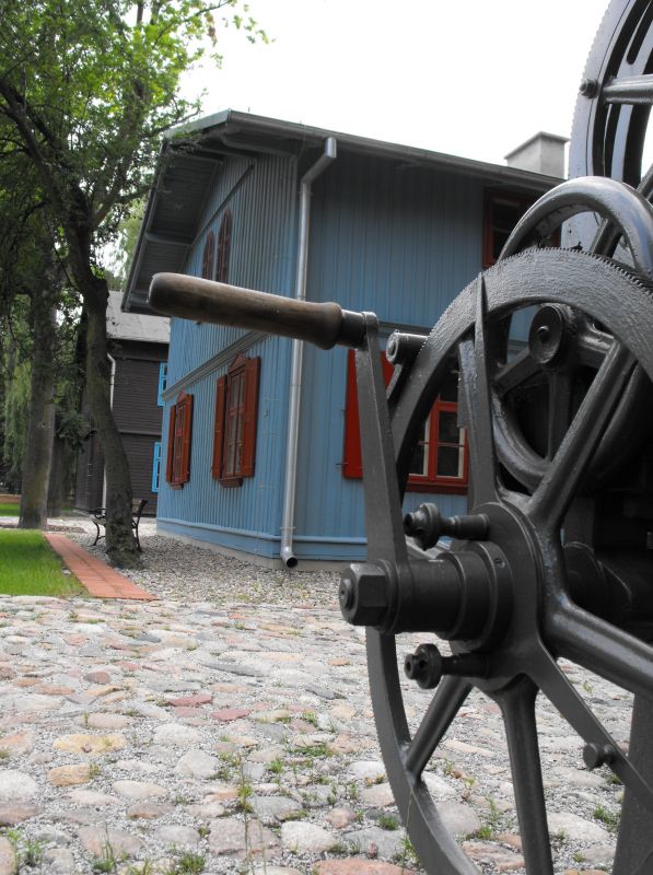 Na pierwszym planie dekoracyjna maszyna włókiennicza, w głębi widoczny robotniczy dom drewniany.