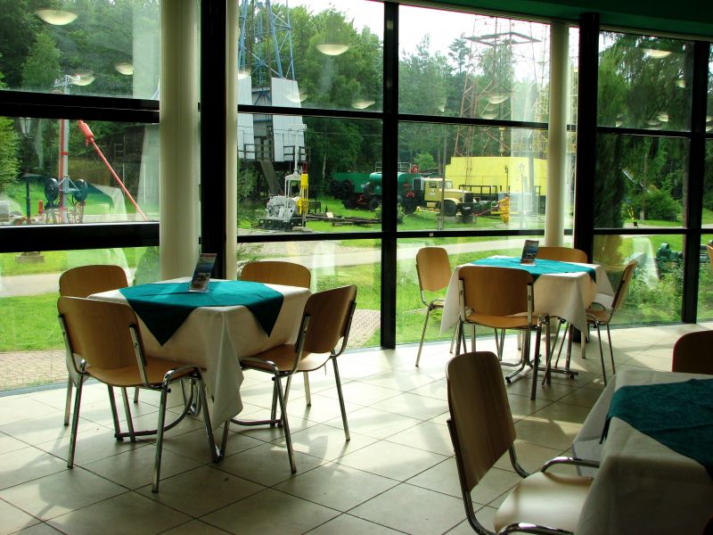 Bufet w pawilonie wystawowym. Z okien widok na ekspozycję wież wiertniczych.