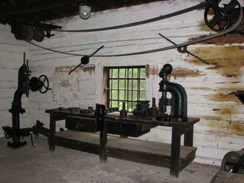 Wnętrze warsztatu kopalni Bóbrka wybudowanego w 1864 roku. Znajdują się tam zabytkowe urządzenia i maszyny: prasy, formy do pras i narządzia do obsługi maszyn.