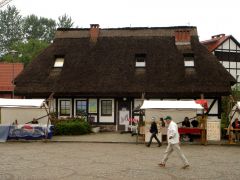 Najważniejszą częścią ekspozycji – zagrody rybackiej – jest chata, w której zgromadzono pochodzące z przełomu wieków XIX i XX eksponaty z Jamna oraz sąsiedniej wsi Łabusz. Wyposażenie wzbogacono przedmiotami pochodzącymi z pomorskich wsi, podobnymi do tych, które występowały również w Jamnie. Chata, jak inne budynki, zbudowana jest w konstrukcji ryglowej wypełnionej szachulcem – drewniane bale ułożone w kratownicę były wypełniane gliną zmieszaną z sieczką, trocinami czy wiórami, a następnie tynkowane; dachy zaś kryto trzciną. W chałupie znajdują się trzy izby, dwie komory, kuchnia, sień oraz chlewik. Co należy podkreślić, w trakcie przenoszenia budynku odtworzono jego usytuowanie względem stron świata i drogi wiejskiej. Dzięki temu widać, jak wpadało światło do izby i przez które okna mogli zaglądać sąsiedzi. Z kolei, w odremontowanej stodole, pochodzącej z 1882 roku, pierwotnie stojącej we wsi Paproty (oddalonej o około 25 km od Jamna), została otwarta w 2005 r. wystawa pt. „Dzieje kuźni pomorskiej”.