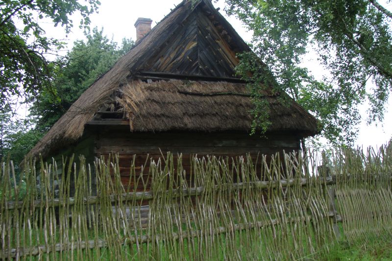 Szczyt chałupy ze wsi Wyryki z 1913 roku. Budynek o konstrukcji zrębowej. Dach półszczytowy kryty słomianą strzechą. Ogród i cała posesja ogrodzona tzw. chruśniakiem – płotem wyplatanym z gałęzi.