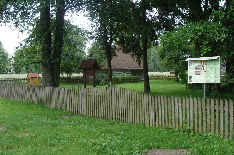 Widok na muzeum. Po prawej stronie tablica informacyjna, po lewej kapliczka, w środku chałupa z Wyryk.