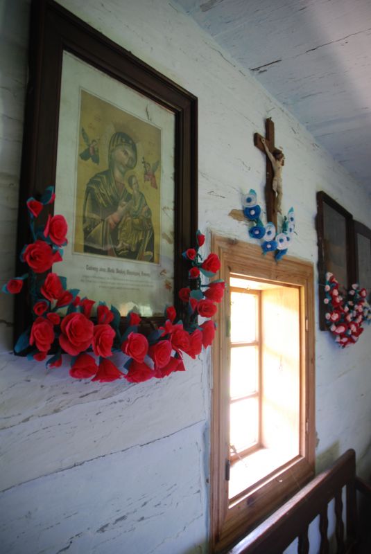 Wnętrze chałupy Szylarów ze wsi Markowa (XVIII/XIX wiek). Typowo rzeszowiackie ozdoby kwiatowe przy obrazach.